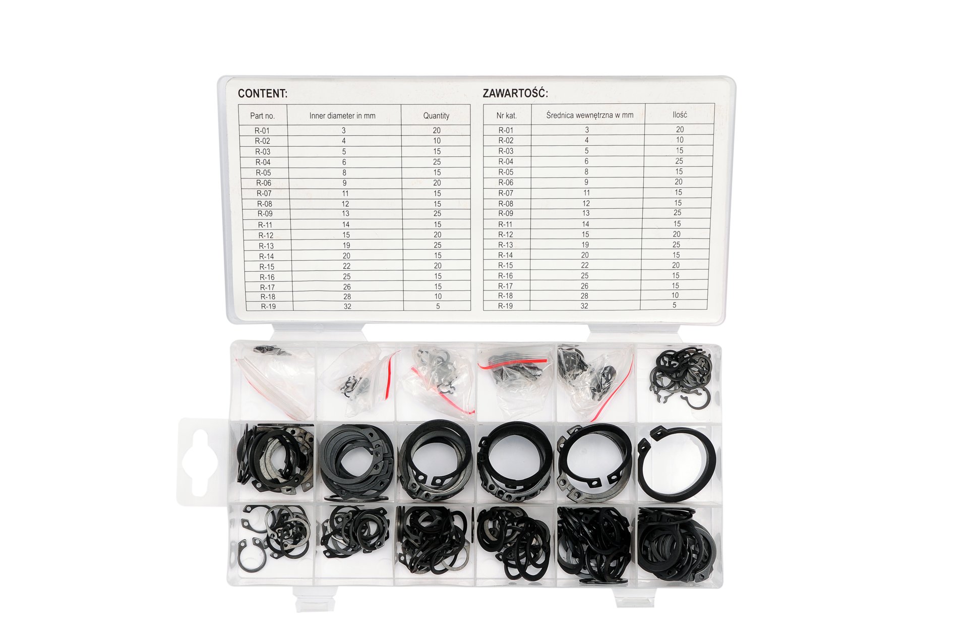 inele exterioare Seger x300 (Ø3 mm x20, Ø4 mm x10, Ø5 mm x15, Ø6 mm x25, Ø8 mm x15, Ø9 mm x20, Ø11 mm x15, Ø12 mm x15, Ø13 mm x25, Ø14 mm x15, Ø15, Ø15 mm mm x25, Ø20 mm x15, Ø22